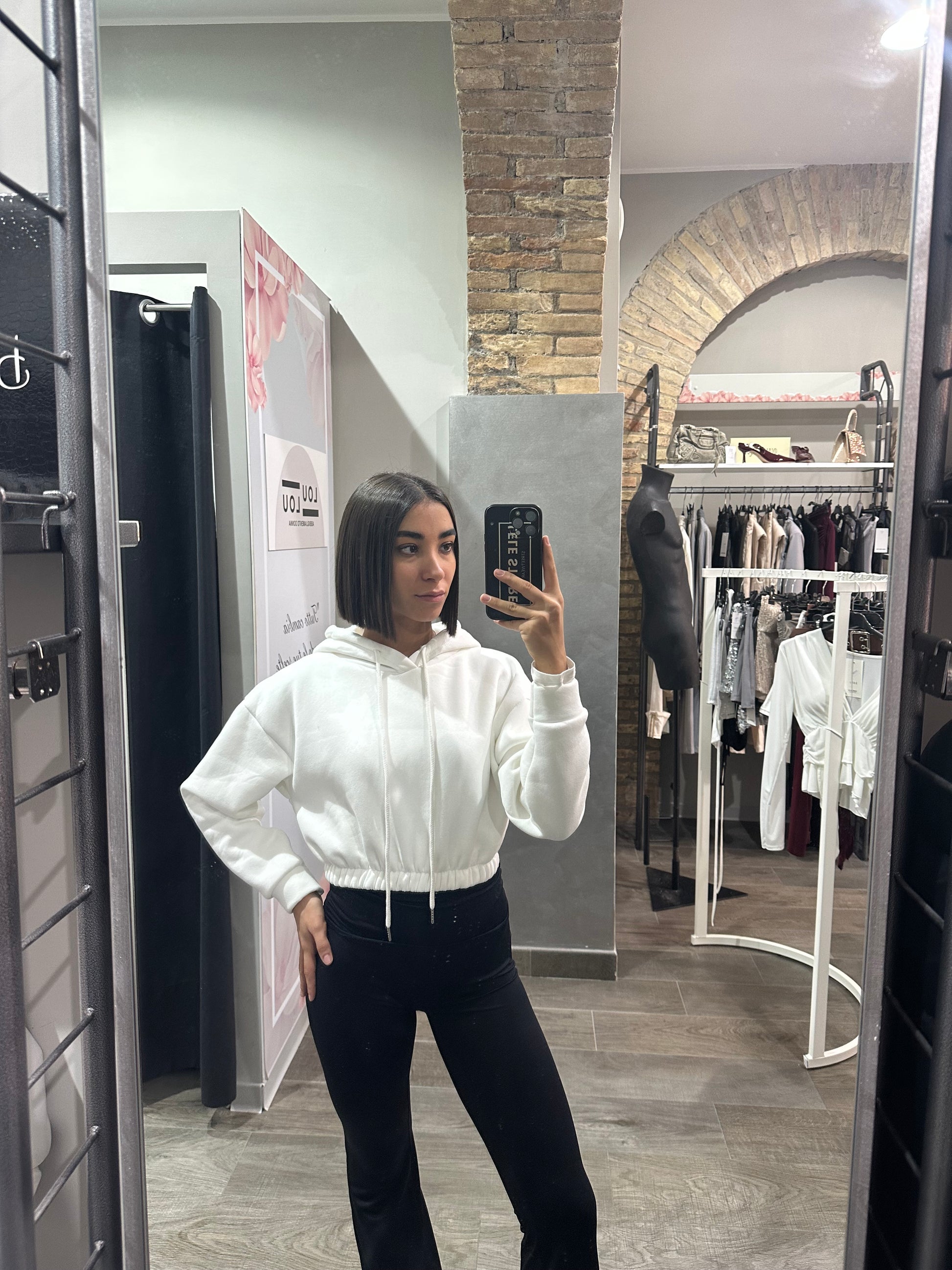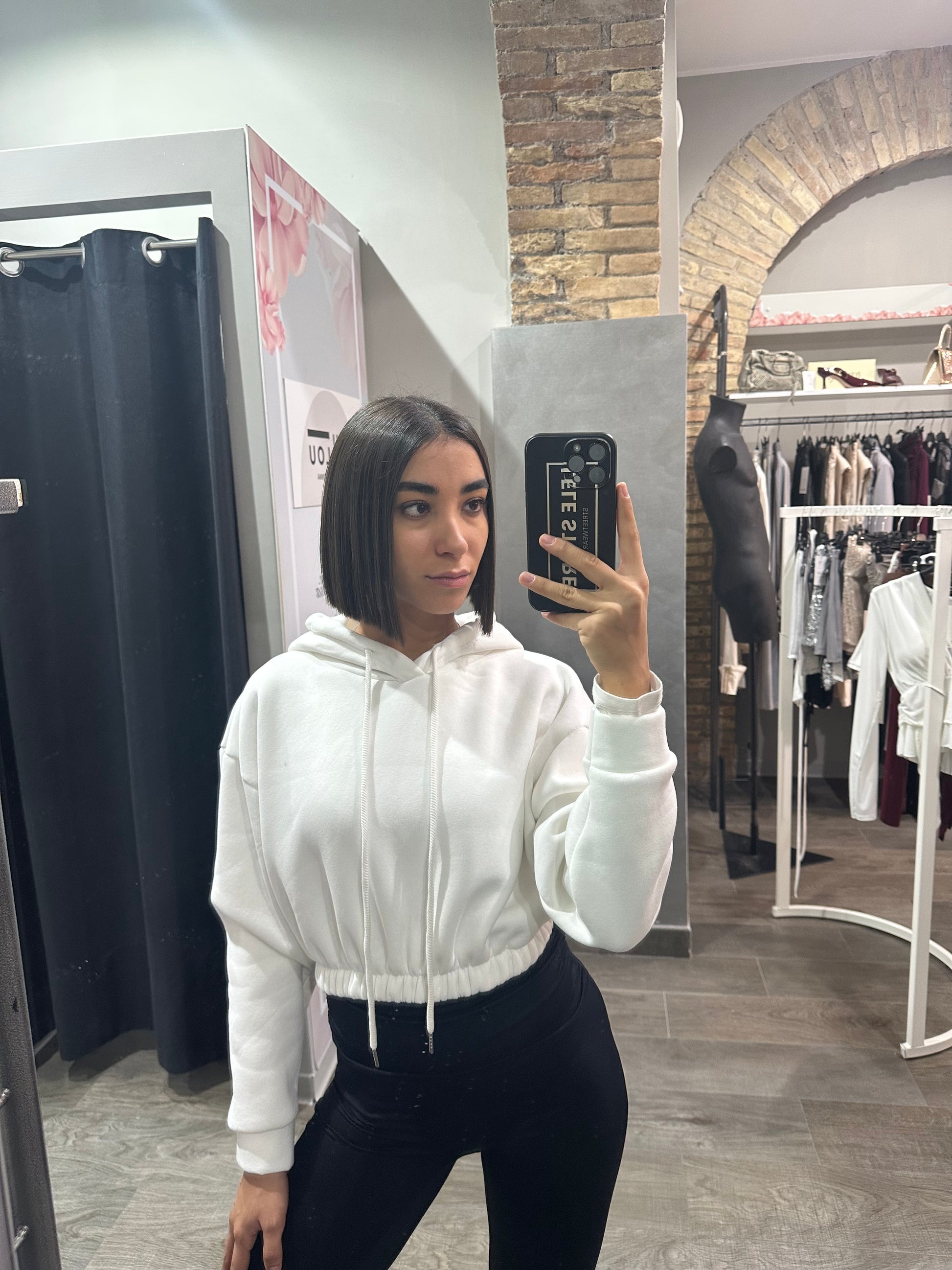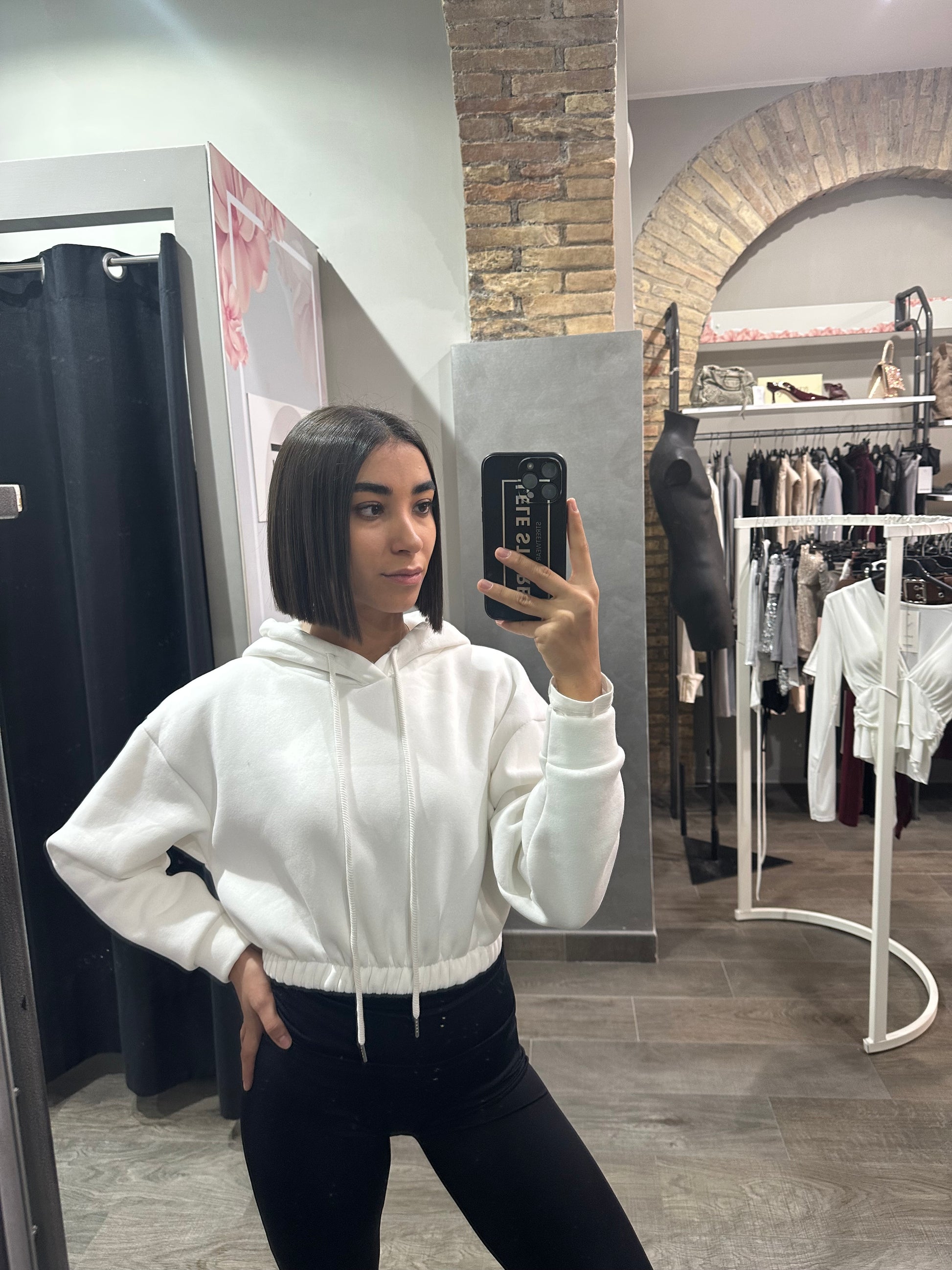 Felpa crop, con cappuccio, lacci e elastico arricciato in vita
