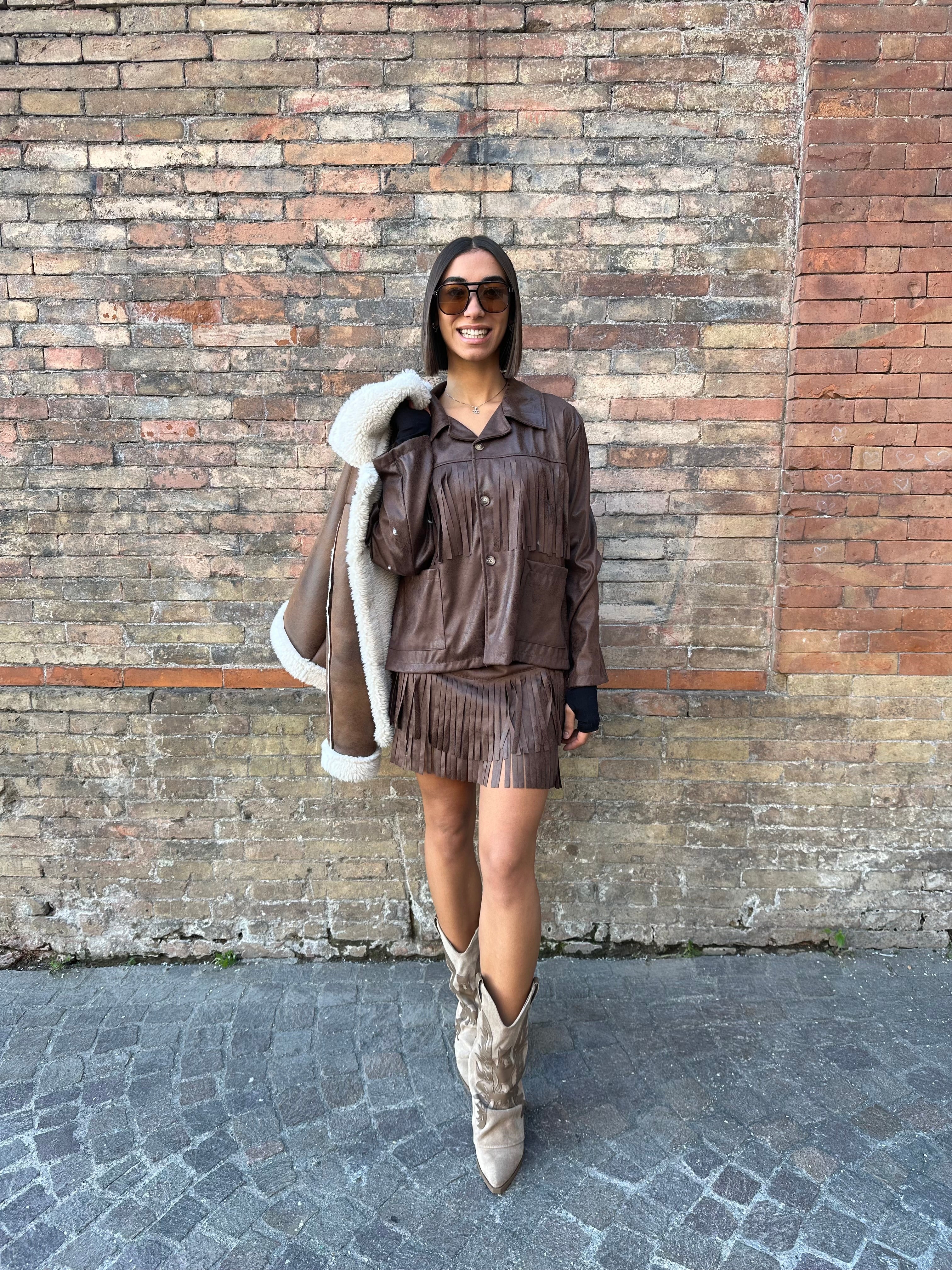 Coordinato con la particolarità del suo tessuto e delle sue frangie, composto da camicetta e gonna